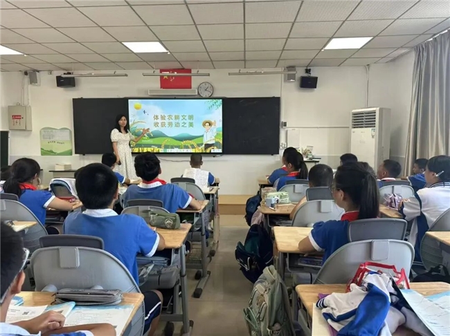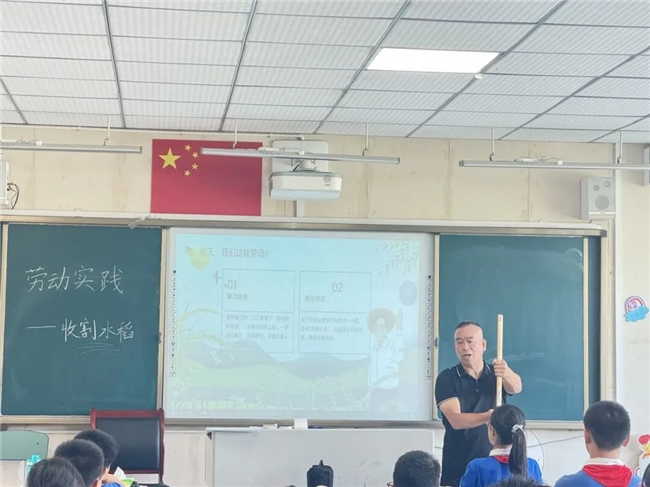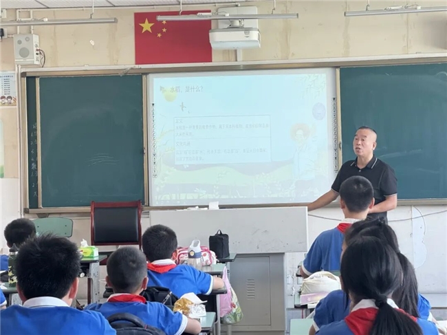 活动前,两个班级的同学们在班主任老师的组织下,开展了以“水稻的一生”为主题的行前学习。通过图文并茂的讲解,孩子们系统了解了水稻从育苗、插秧、生长到成熟的全过程,重点学习了收割技巧、脱粒方法、安全注意事项和纪律规范,同时,课程还融入了关于“秋分”节气与我国“中国农民丰收节”的文化知识。这堂内容扎实的前置课,不仅为孩子们第二天的实地劳动做好了知识储备,也进一步点燃了他们对于亲身实践的热情与期待。