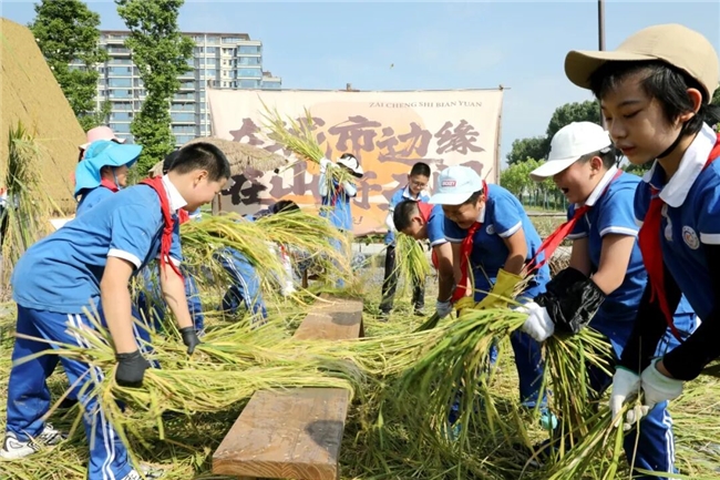 一望无际的金色稻田映入眼帘,沉甸甸的稻穗随风摇曳,仿佛在迎接小小劳动者的到来。在老师和社区工作人员的指导与协助下,孩子们有序领取手套、镰刀等劳动工具,迅速投入“战斗”。田间地头顿时热闹起来:有的孩子弯腰割稻,动作从生疏到熟练;有的负责传递稻束,默契配合;还有的体验传统脱粒,在金黄的稻谷飞扬中感受丰收的喜悦。尽管汗水浸湿了衣襟,但每一张脸上都洋溢着充实而快乐的笑容。