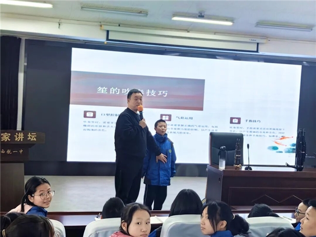 2025年11月11日,由成都市教师共享中心主办、西航港一中承办的“美育天府·百名艺术家进校园”活动圆满落幕。国家二级演员、成都民族乐团管乐声部声部长张谦老师带领师生们穿越时空,领略了中国最古老乐器之一——笙的独特魅力,在校园内掀起了一场传统美育的热潮。