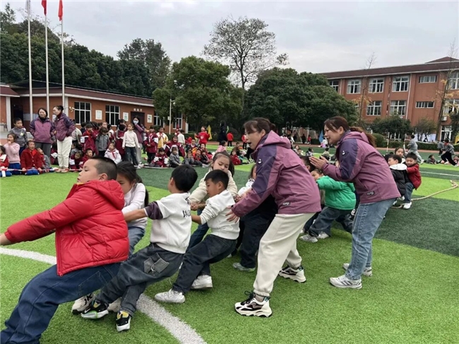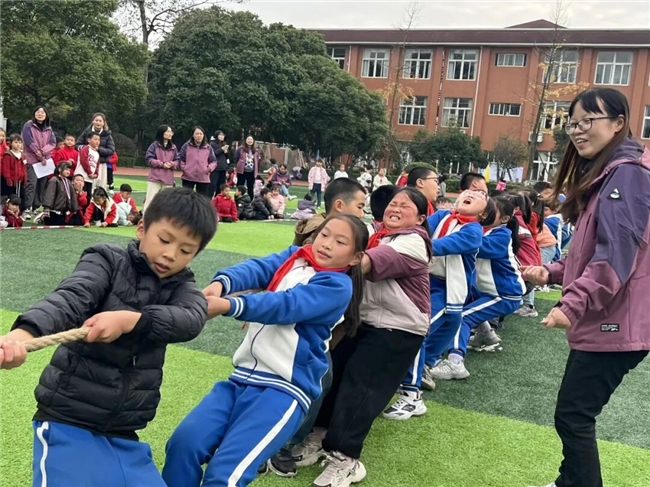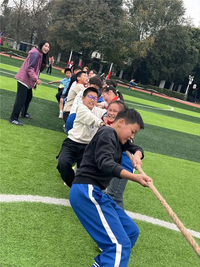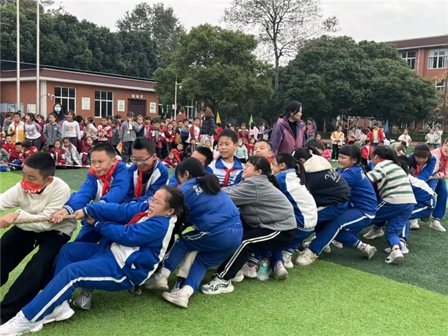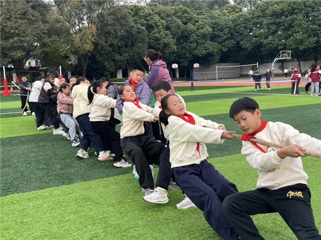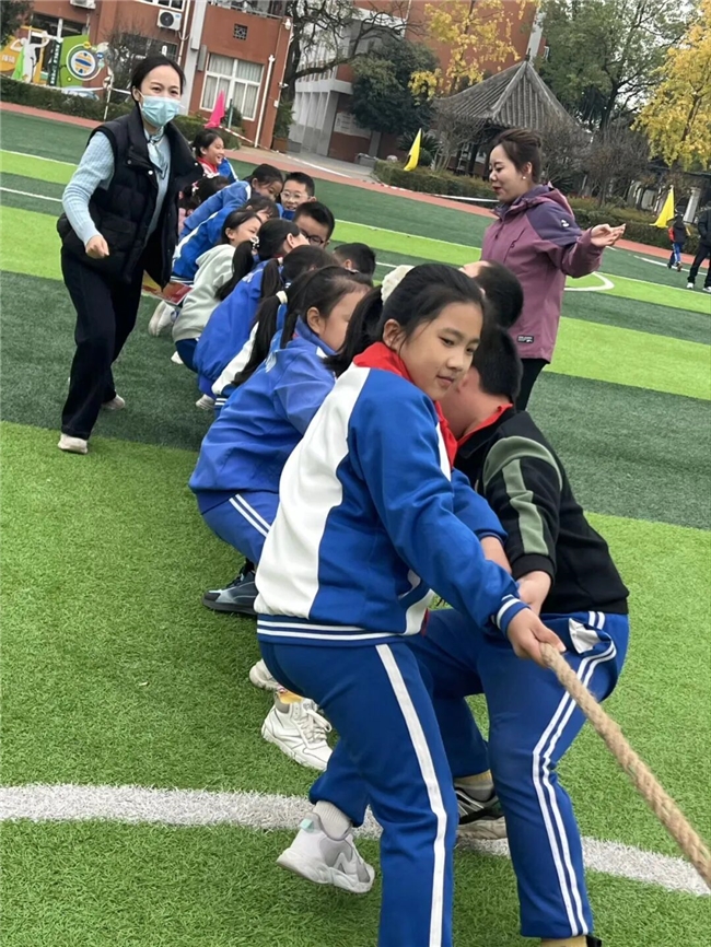 拔河比赛现场气氛热烈到顶点!各班队员们紧紧握住麻绳,身体后倾、双脚蹬地,一张张小脸憋得通红,齐心协力往后拉。中间的红绳在两队之间来回拉锯,赛场边的加油声、呐喊声此起彼伏,震耳欲聋。志愿者协助摆放拔河绳、标记中线,在两侧维持秩序,保障比赛安全有序。