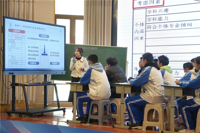 双流棠湖中学教师童瑶展示思政课例《问辩时代,智“绘”未来——价值判断与价值选择》。课程立足思政学科核心素养,通过创设情境、组织思辨,引导学生深入理解个人价值选择与社会发展的辩证关系,充分彰显了思政课在生涯发展中的铸魂育人功能,实现了思想启迪与生涯动力的双向赋能。