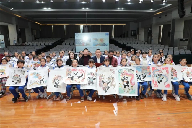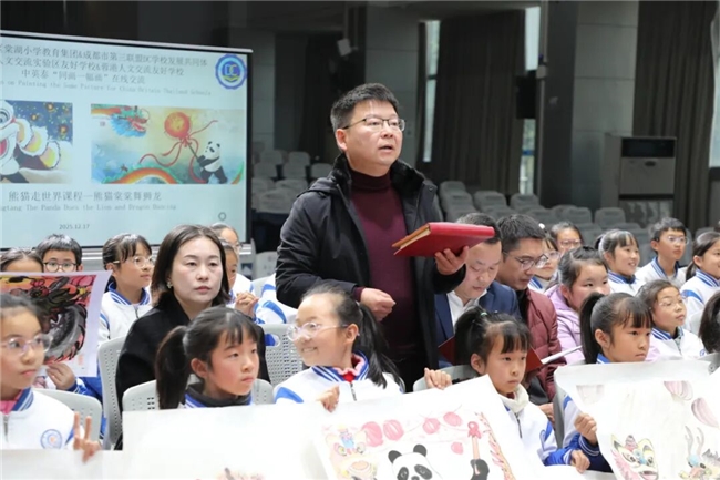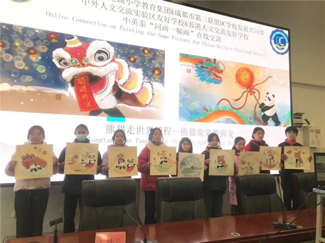 2025年12月17日,海棠红妆已褪,凛枝傲然于风。成都市双流区棠湖小学教育集团携手成都市第三联盟DC学校发展共同体、中外人文交流实验区友校、蓉港人文交流友校、英国、泰国友校11所学校跨越山海,相聚云端,共同开启中英泰“同画一幅画”——熊猫走世界精品课程《熊猫棠棠游四川》儿童国画课程共建共享特色交流活动。本次活动以儿童国画课程《熊猫棠棠游四川》为载体,围绕绘本《熊猫棠棠舞狮龙》展开,来自中、英、泰三国的师生们以画笔为舟,以色彩为桥,共同交流分享舞狮舞龙这一中华传统文化主题的课程成果。
