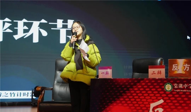 统分间隙,周然、胡海燕两位老师上台专业点评。周然老师高度肯定辩手们的逻辑思维与知识储备,赞扬大家将议题与学习实际紧密结合,临场应变与团队协作表现突出,并鼓励同学们将思辨精神延续到日常学习;胡海燕老师从语言表达与思想深度切入,称赞辩手发言兼具意气风发与理性思考,既注重逻辑严谨性,又体现新时代高中生的责任担当,寄语大家保持探索欲与求真心。两位评委的点评专业精准、饱含温情,让在场师生深受启发。