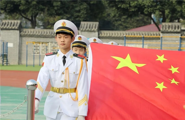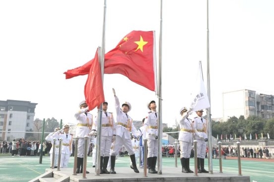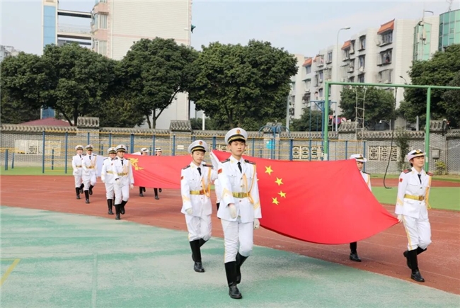 庄严的《出旗曲》响起,护旗手步伐铿锵,护卫国旗走向旗台。全体师生肃立注目,五星红旗在雄壮的国歌声中冉冉升起,迎风飘扬。随后,校旗与少年军校军旗相继升起,全校师生齐唱校歌,展现棠小学子昂扬向上的精神风貌。