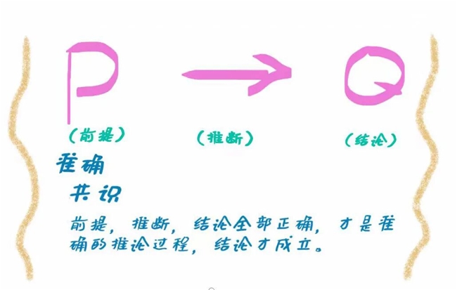 在正确的前提下,就可以进行推断,这个过程中的任何一个步骤都必须正确。最后,得到一个结论Q。