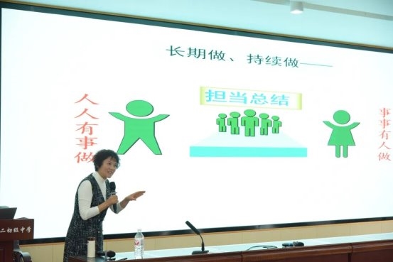培训中,孙晓晖老师以其三十余年的一线德育探索经验,系统解析了“修身班会课程”的创新理念与实践体系。她直击当前班级德育工作中“说教无效、管理乏力、内化不足、针对性不强”等现实困惑,重点阐述了通过“全员担当”隐性课程与修身班会显性课程深度融合的破解路径。